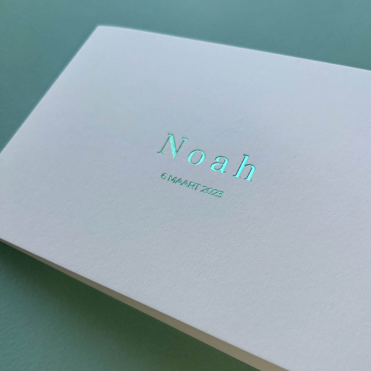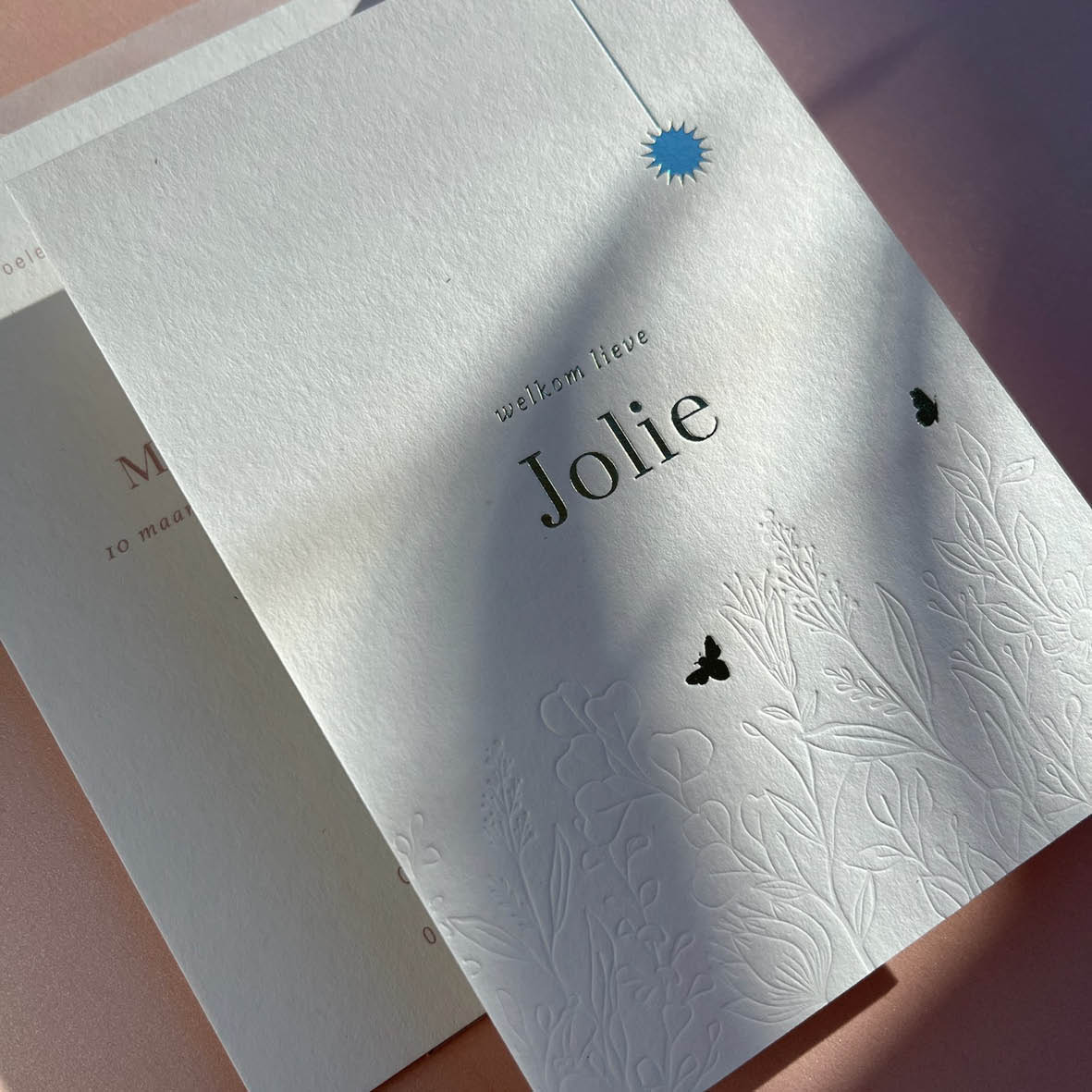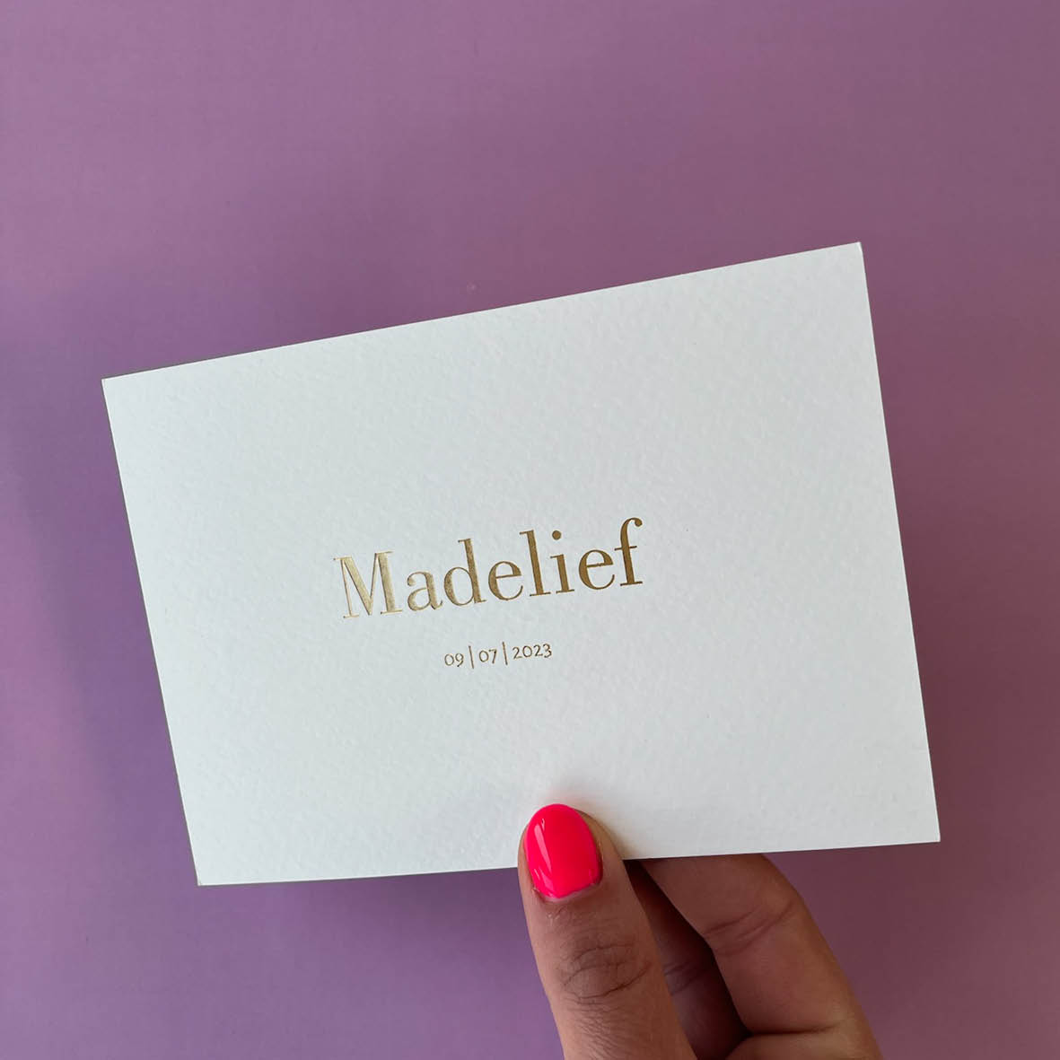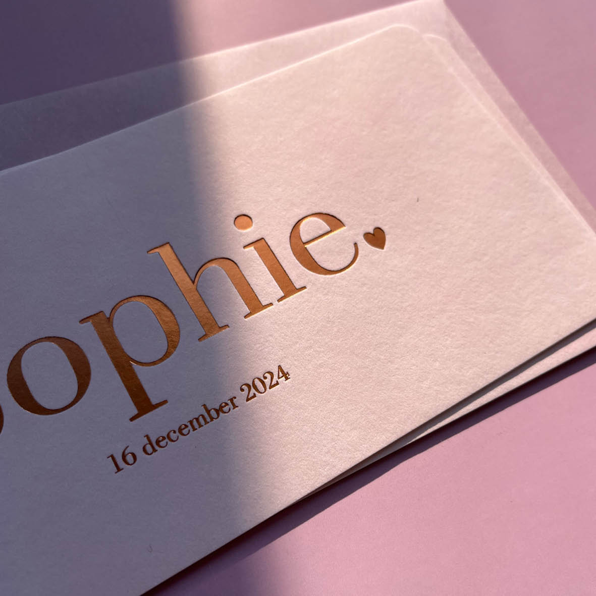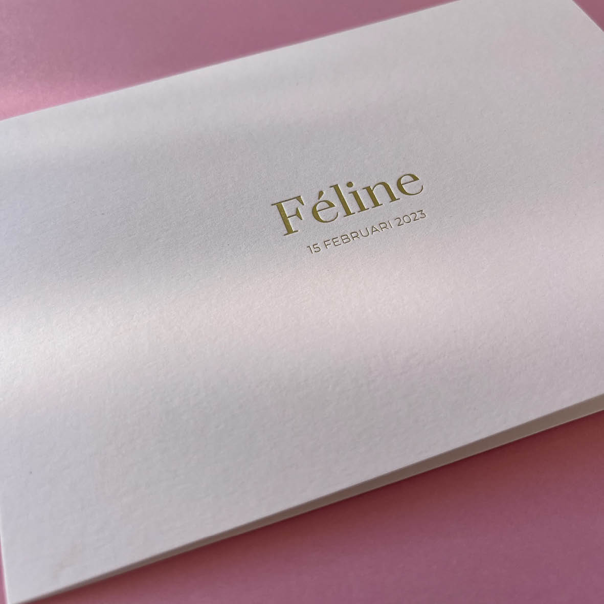 Folie geeft een geboortekaartje een luxe en verfijnde uitstraling. Van subtiele accenten tot een opvallende naam in goud, zilver of roségoud (traditionele foliedruk zelfs in maar liefst 24 kleuren beschikbaar!). Met foliedruk maak je van elk geboortekaartje een bijzonder en tijdloos ontwerp. Laat je inspireren door wat we al gemaakt hebben en ontdek hoe foliedruk jouw geboortekaartje net dat beetje extra geeft.