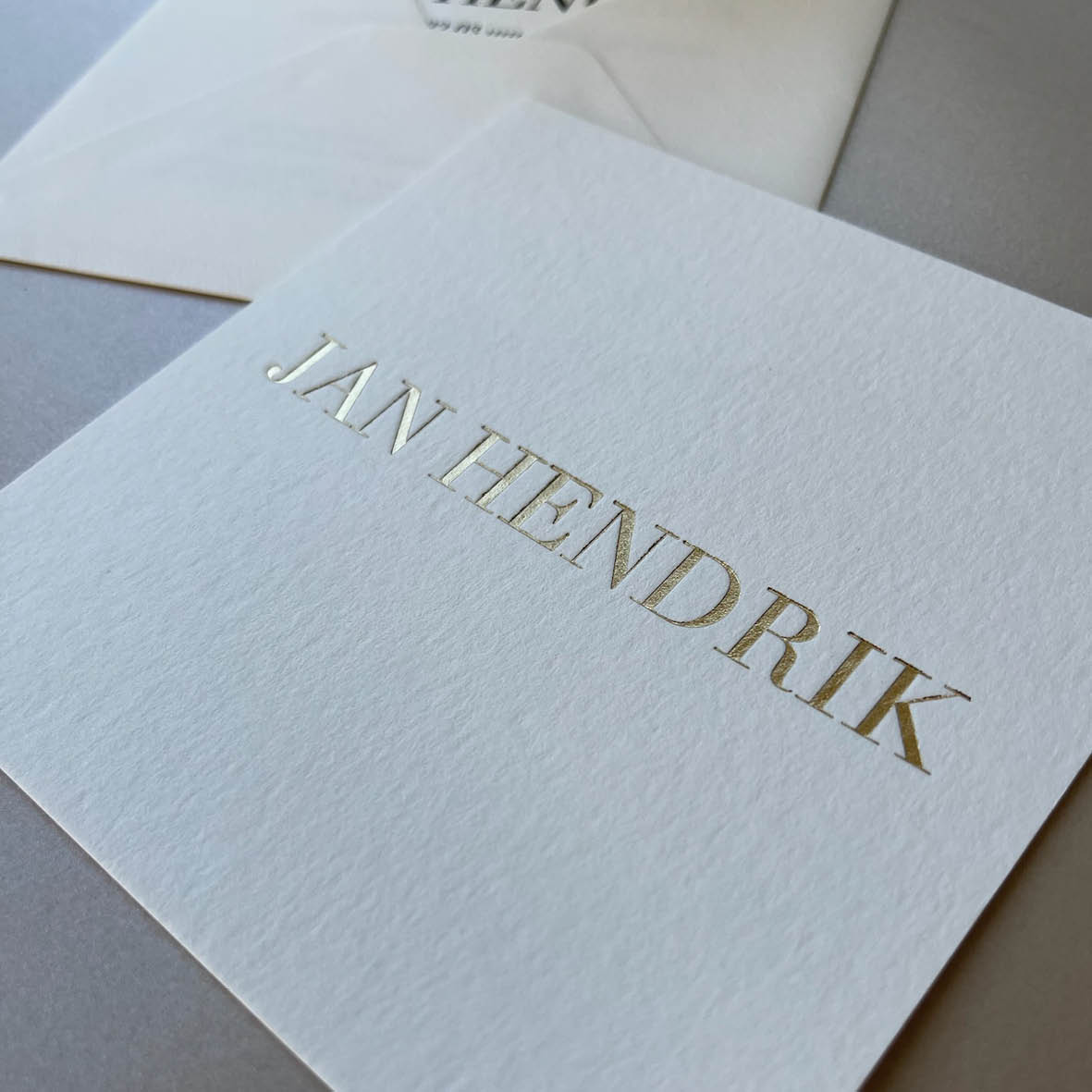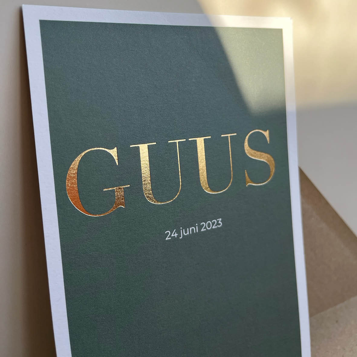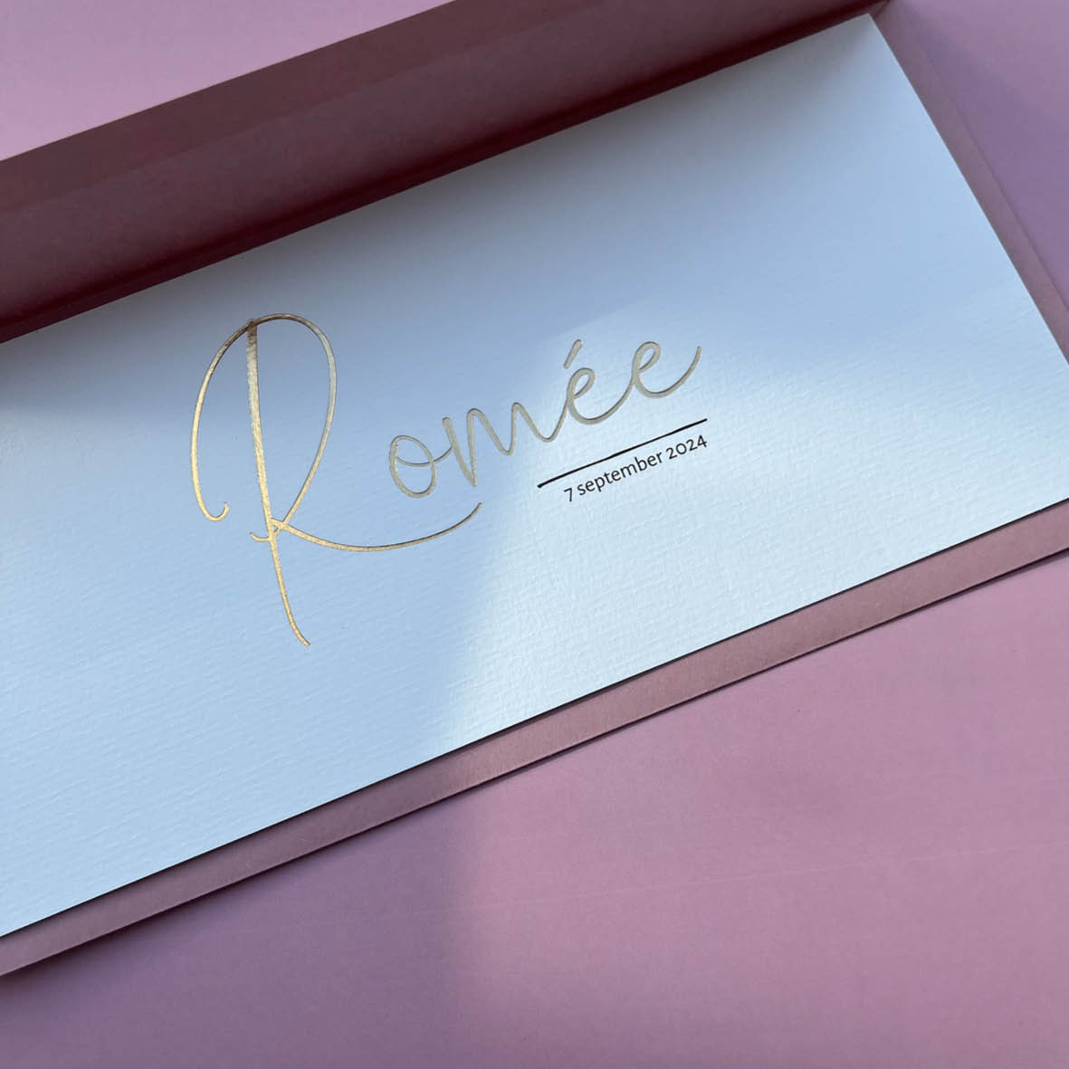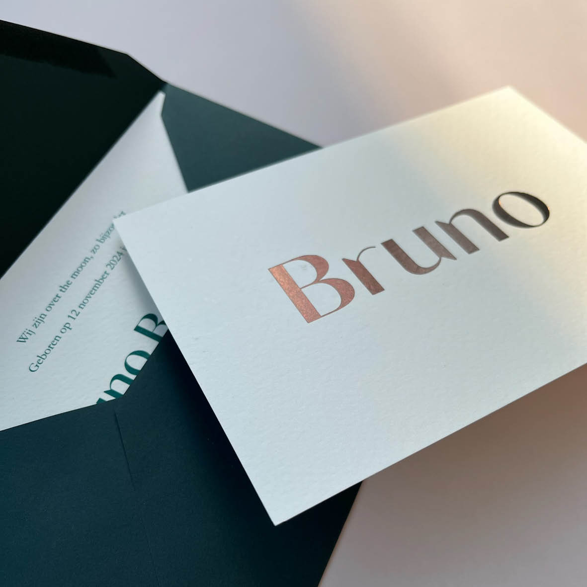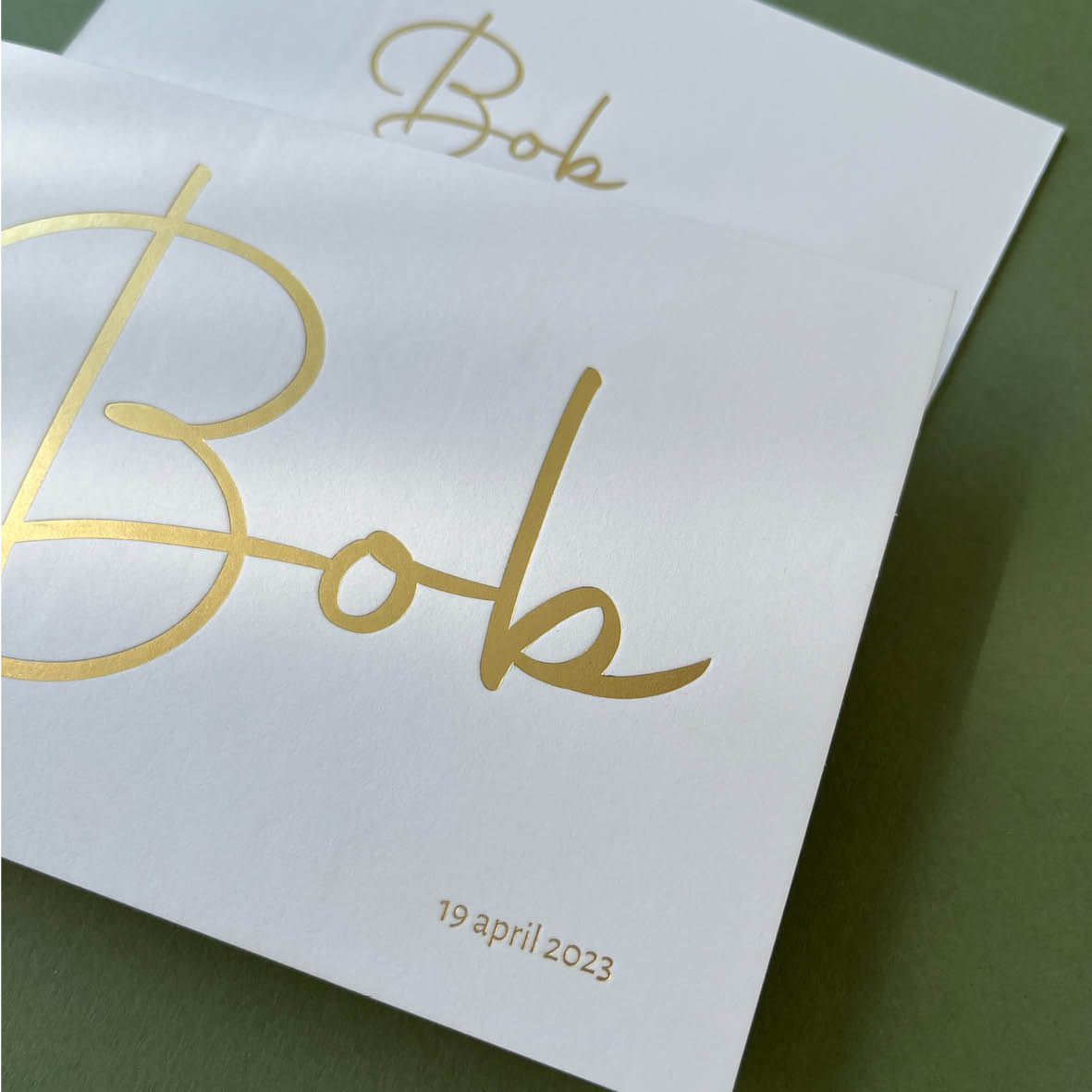 Folie geeft een geboortekaartje een luxe en verfijnde uitstraling. Van subtiele accenten tot een opvallende naam in goud, zilver of roségoud (traditionele foliedruk zelfs in maar liefst 24 kleuren beschikbaar!). Met foliedruk maak je van elk geboortekaartje een bijzonder en tijdloos ontwerp. Laat je inspireren door wat we al gemaakt hebben en ontdek hoe foliedruk jouw geboortekaartje net dat beetje extra geeft.