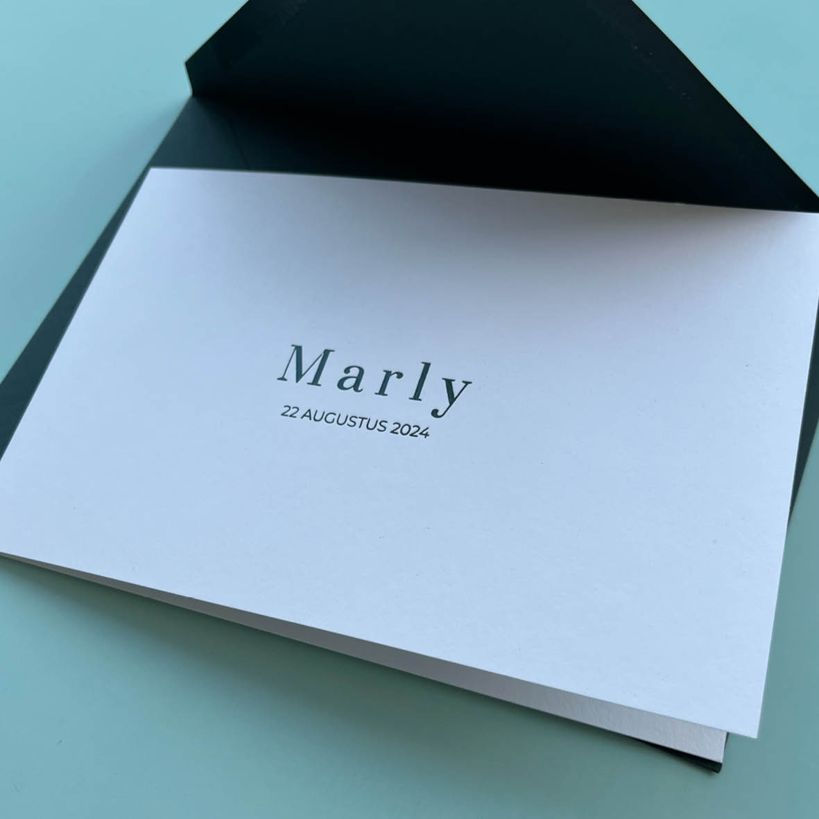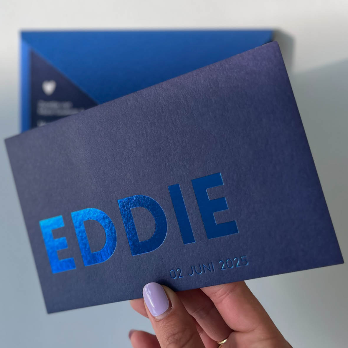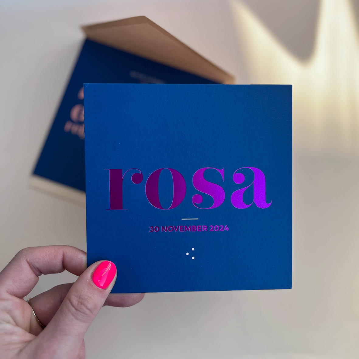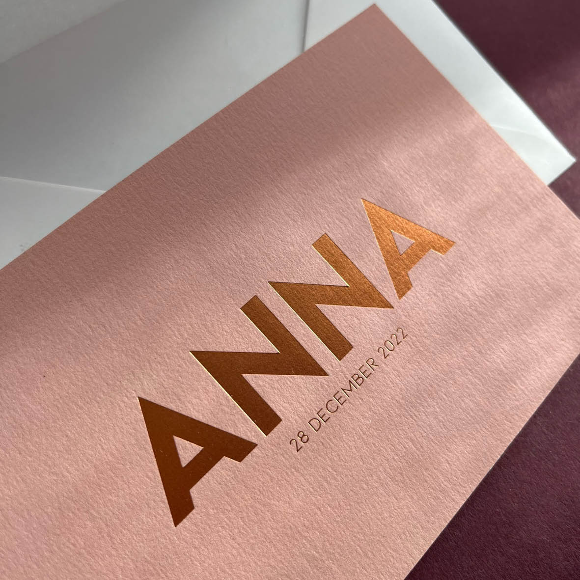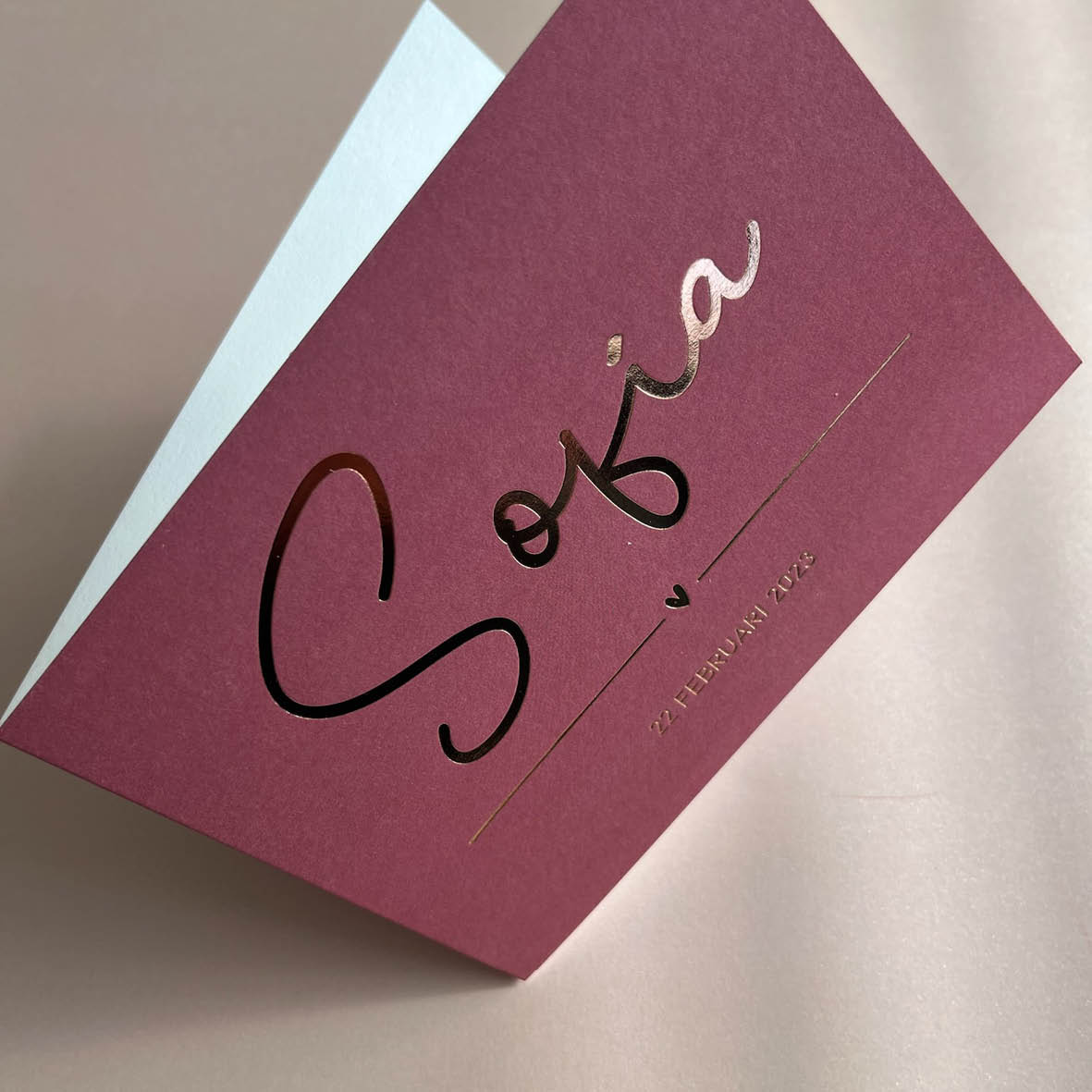 Folie geeft een geboortekaartje een luxe en verfijnde uitstraling. Van subtiele accenten tot een opvallende naam in goud, zilver of roségoud (traditionele foliedruk zelfs in maar liefst 24 kleuren beschikbaar!). Met foliedruk maak je van elk geboortekaartje een bijzonder en tijdloos ontwerp. Laat je inspireren door wat we al gemaakt hebben en ontdek hoe foliedruk jouw geboortekaartje net dat beetje extra geeft.