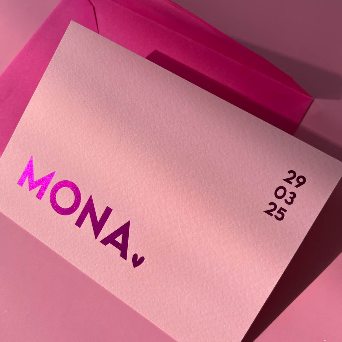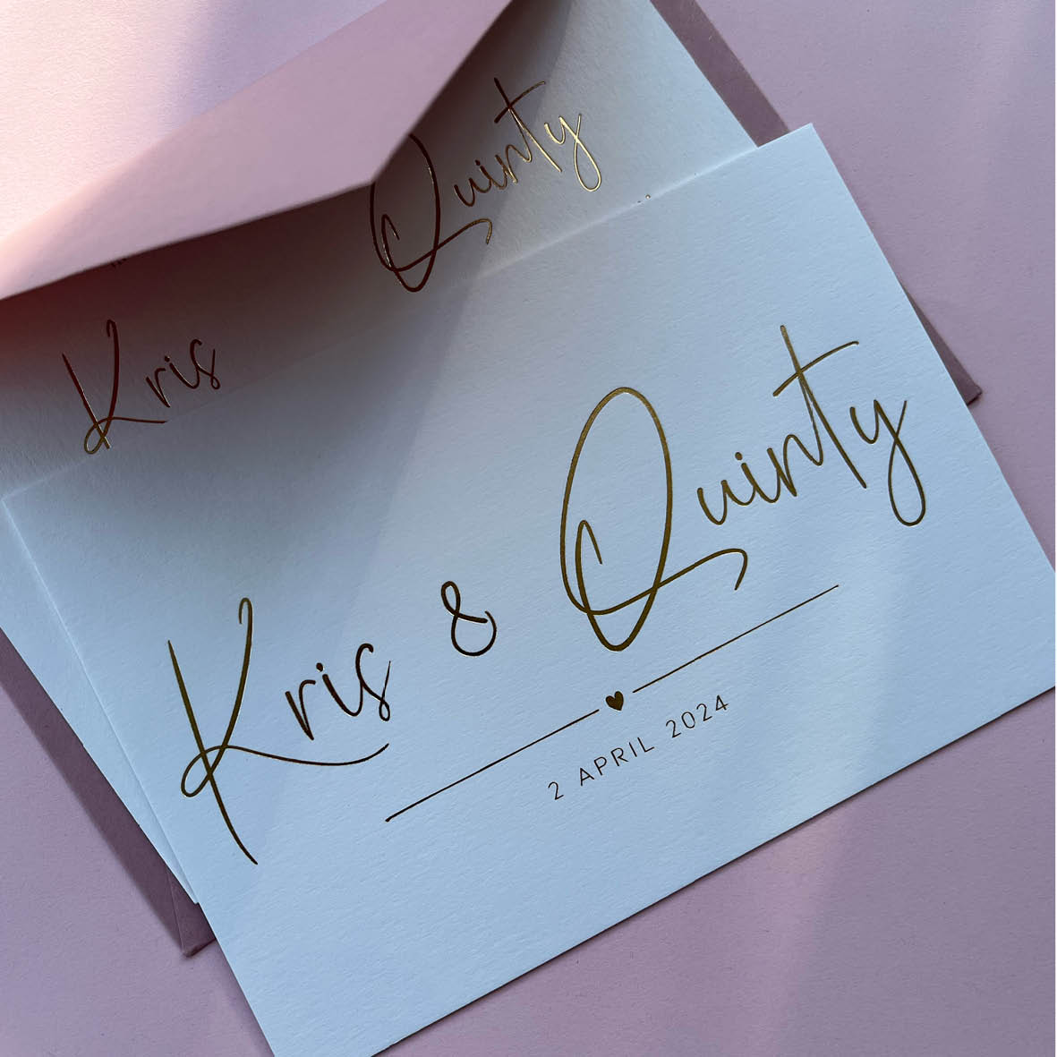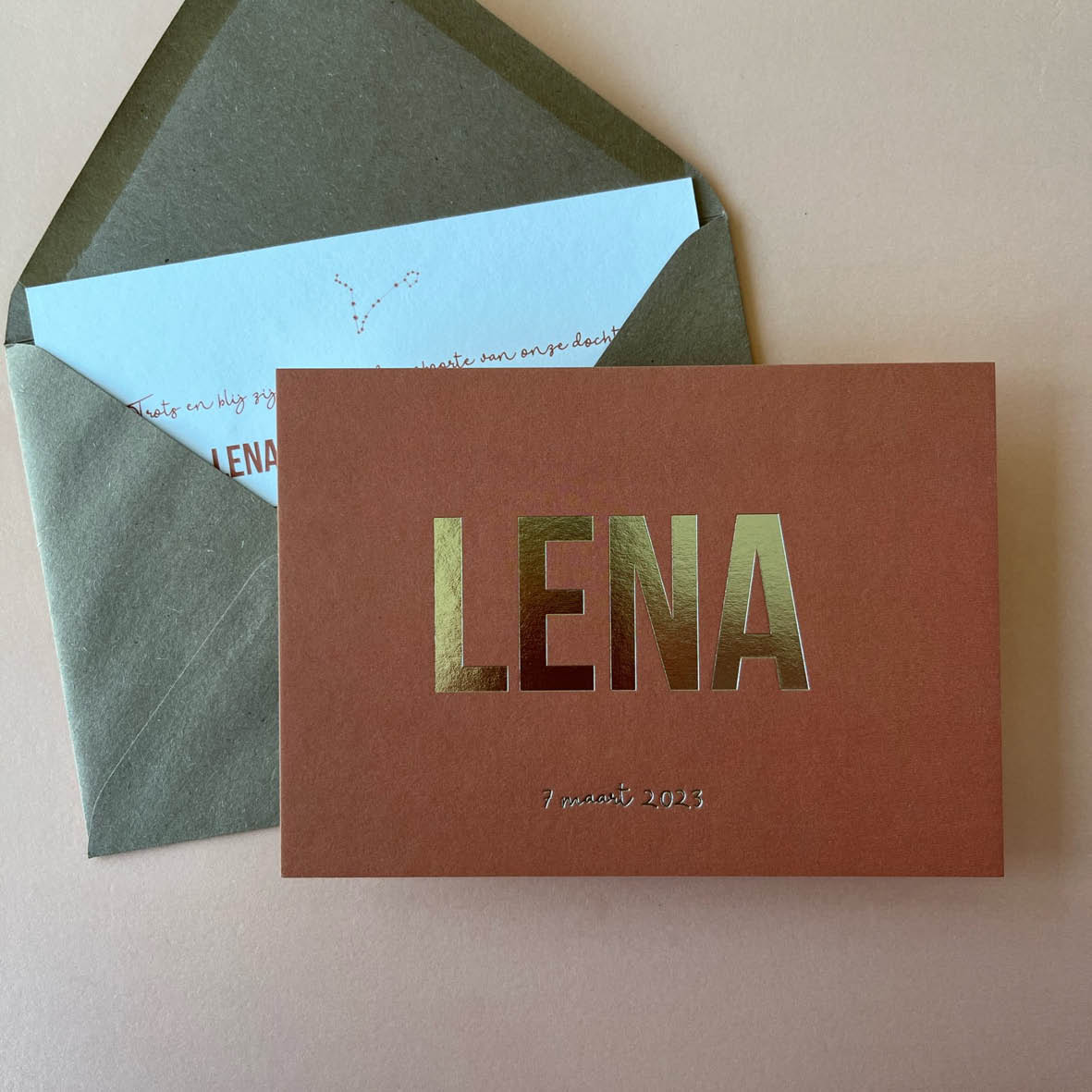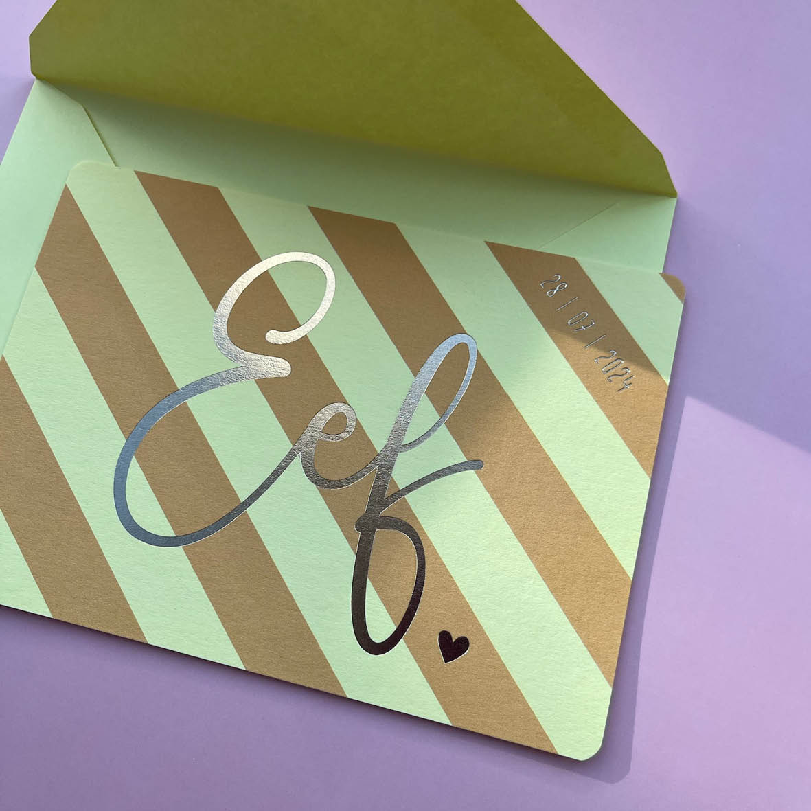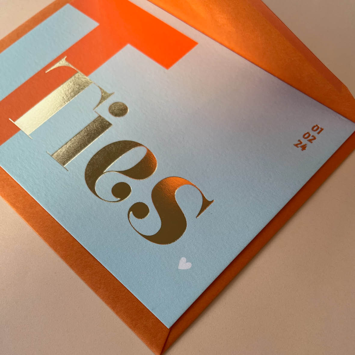 Folie geeft een geboortekaartje een luxe en verfijnde uitstraling. Van subtiele accenten tot een opvallende naam in goud, zilver of roségoud (traditionele foliedruk zelfs in maar liefst 24 kleuren beschikbaar!). Met foliedruk maak je van elk geboortekaartje een bijzonder en tijdloos ontwerp. Laat je inspireren door wat we al gemaakt hebben en ontdek hoe foliedruk jouw geboortekaartje net dat beetje extra geeft.