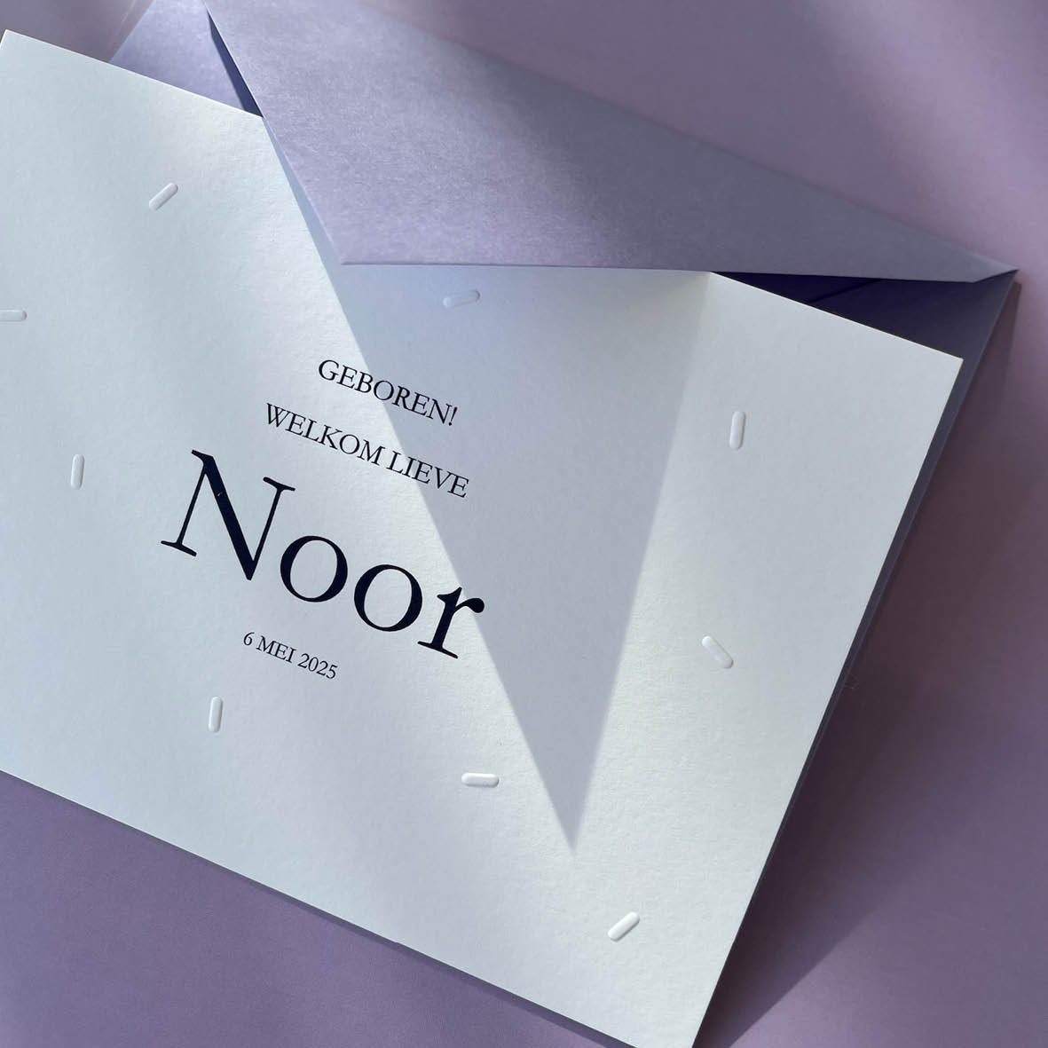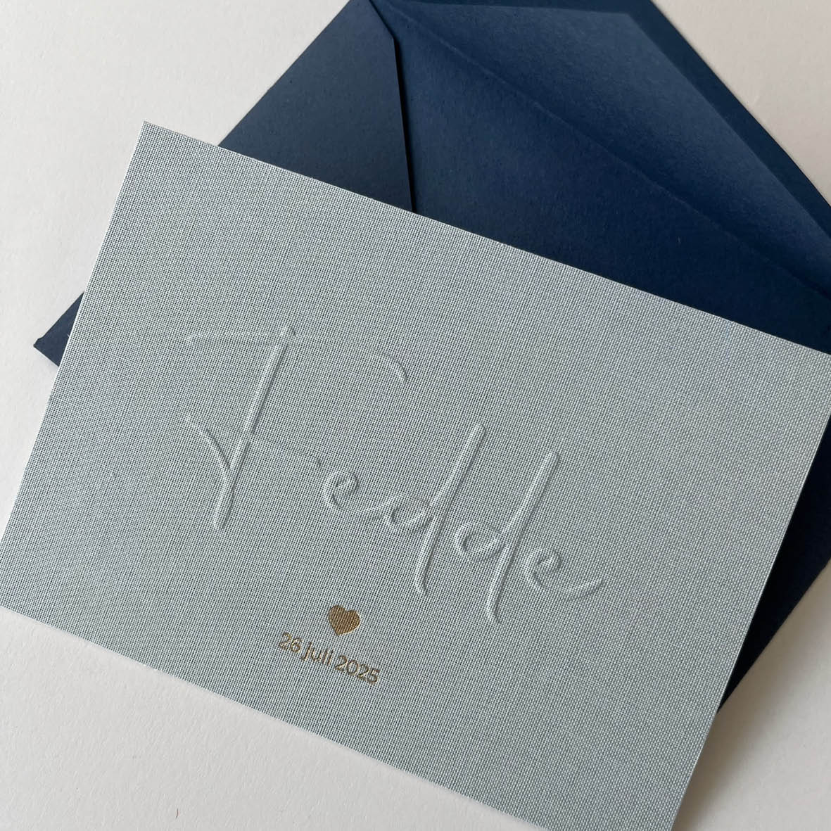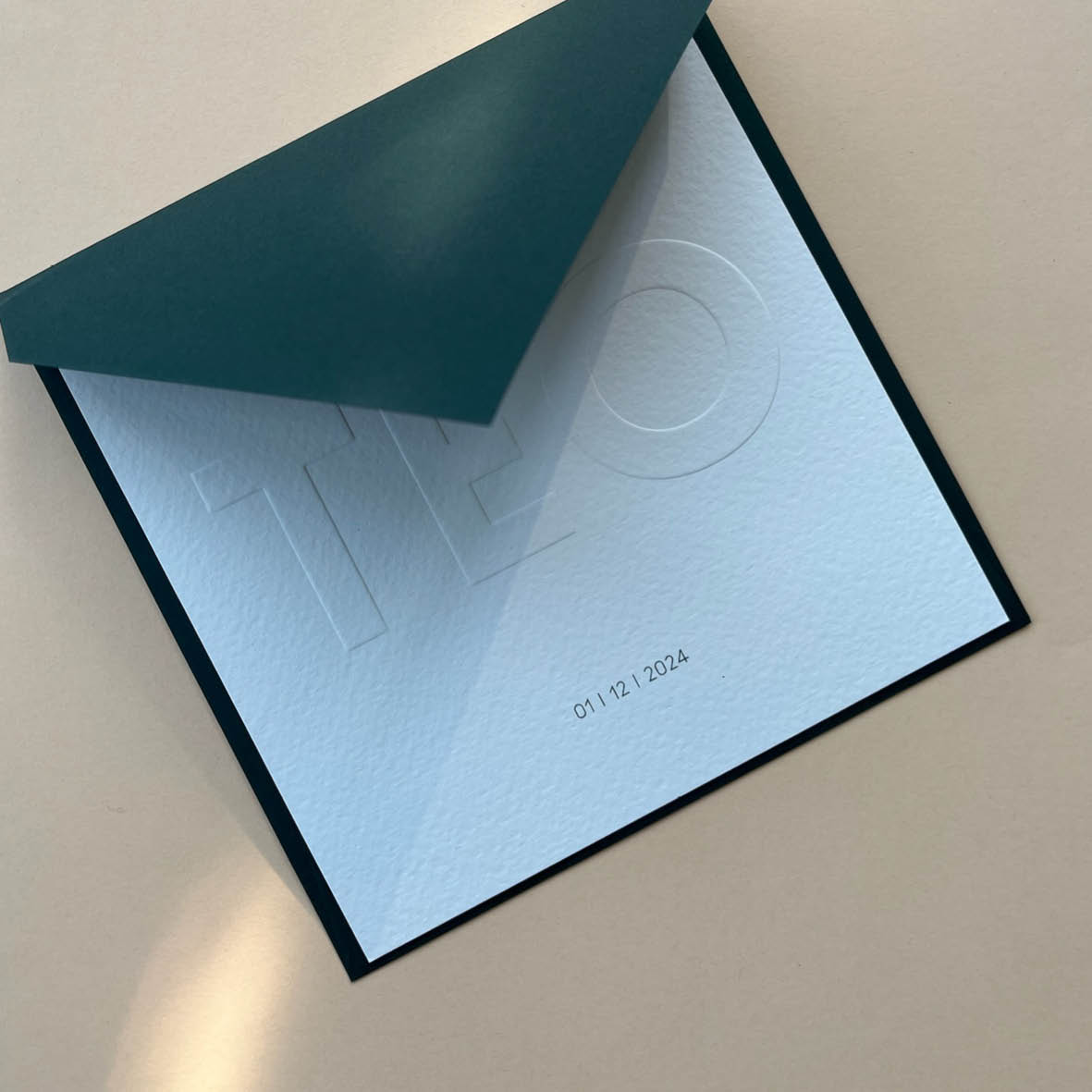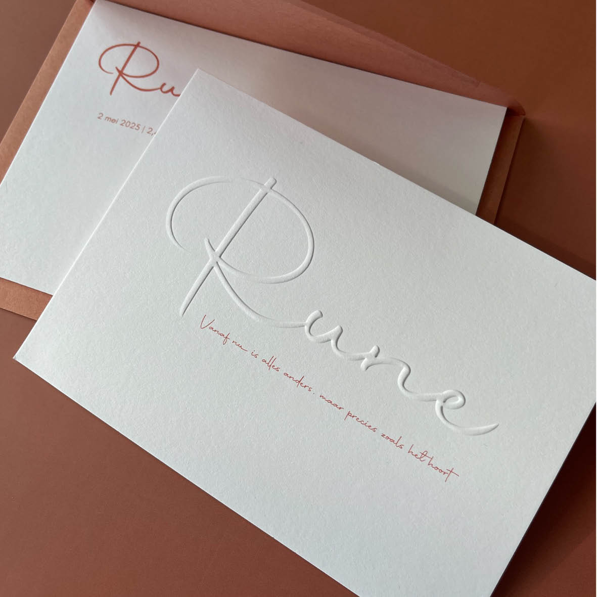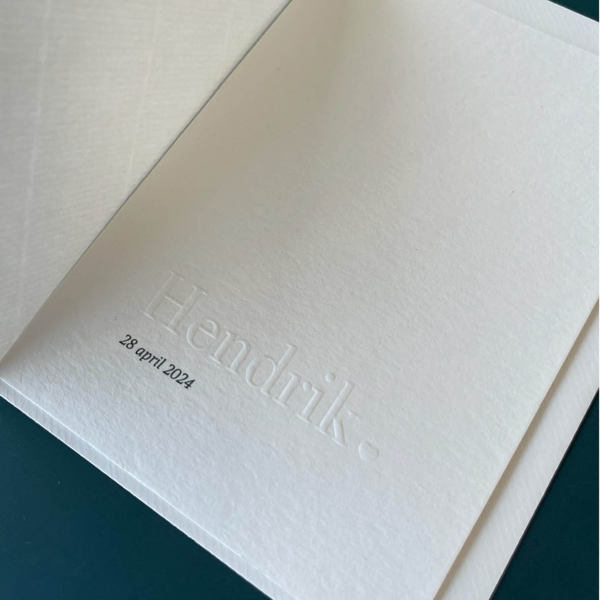 Geboortekaartjes met reliëfdruk (preeg) hebben een subtiele, tastbare uitstraling. Door delen van het ontwerp verhoogd in het papier te drukken ontstaat een elegant hoogteverschil, zonder inkt of kleur toe te voegen. Dit maakt reliëfdruk perfect voor minimalistische en tijdloze geboortekaartjes.