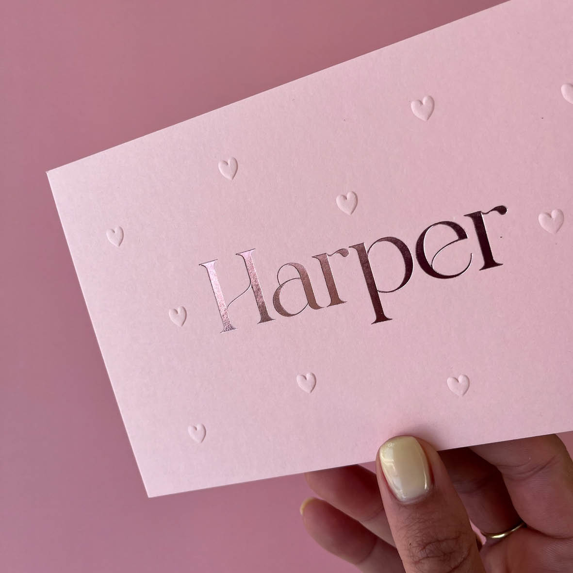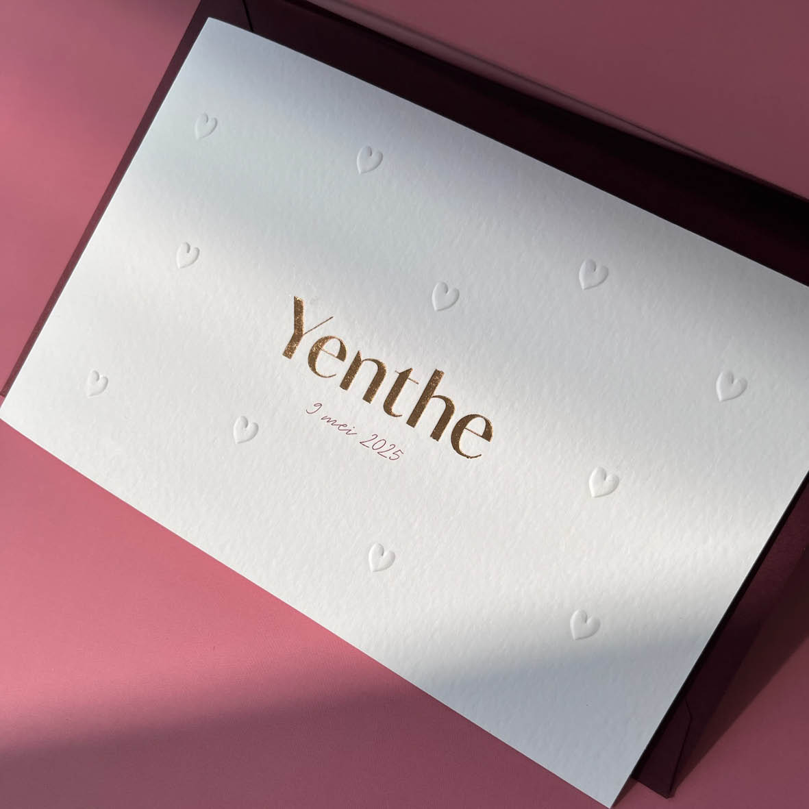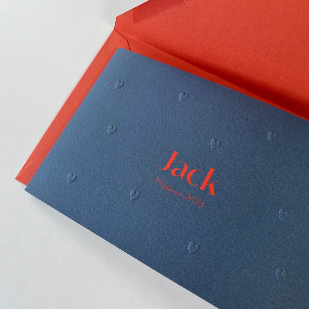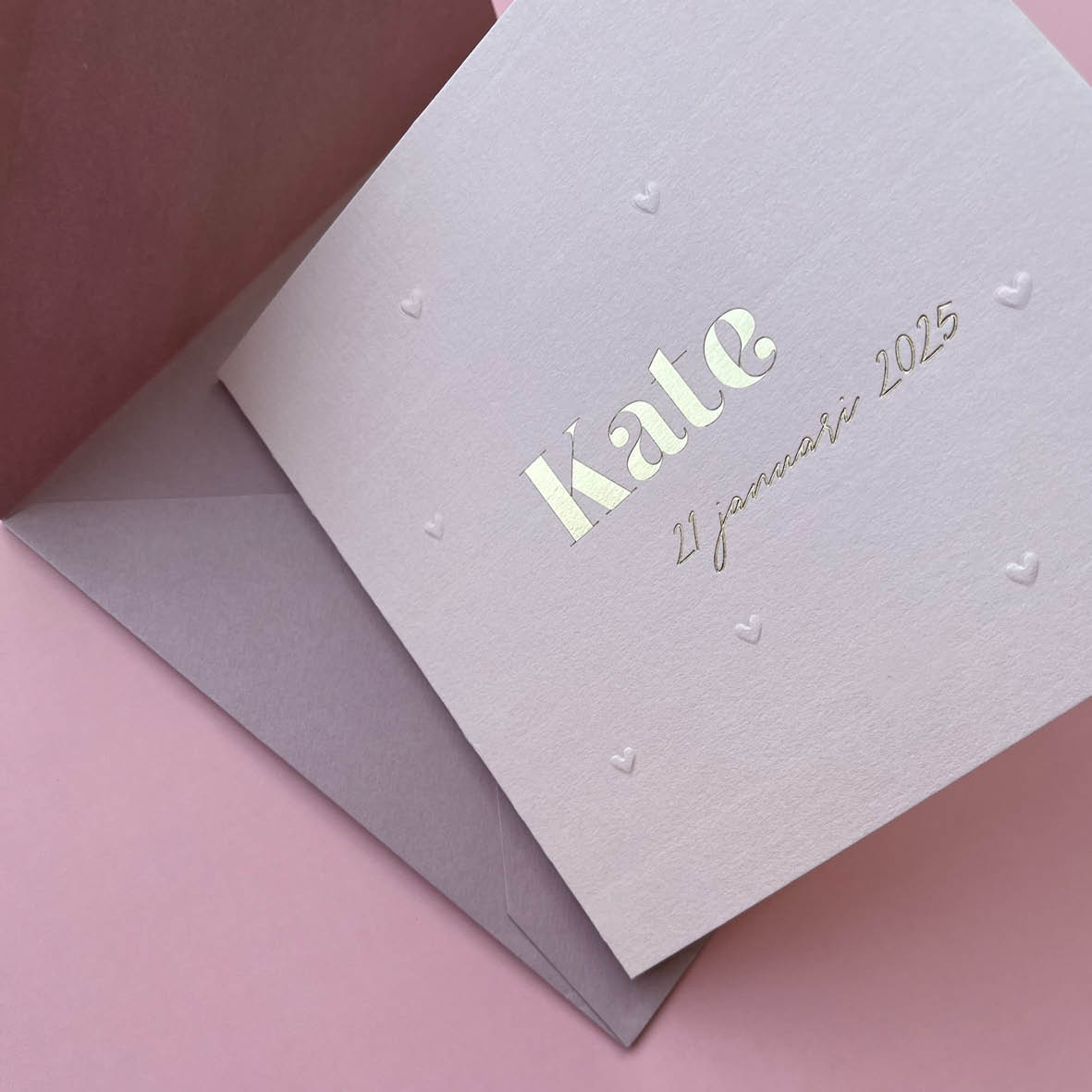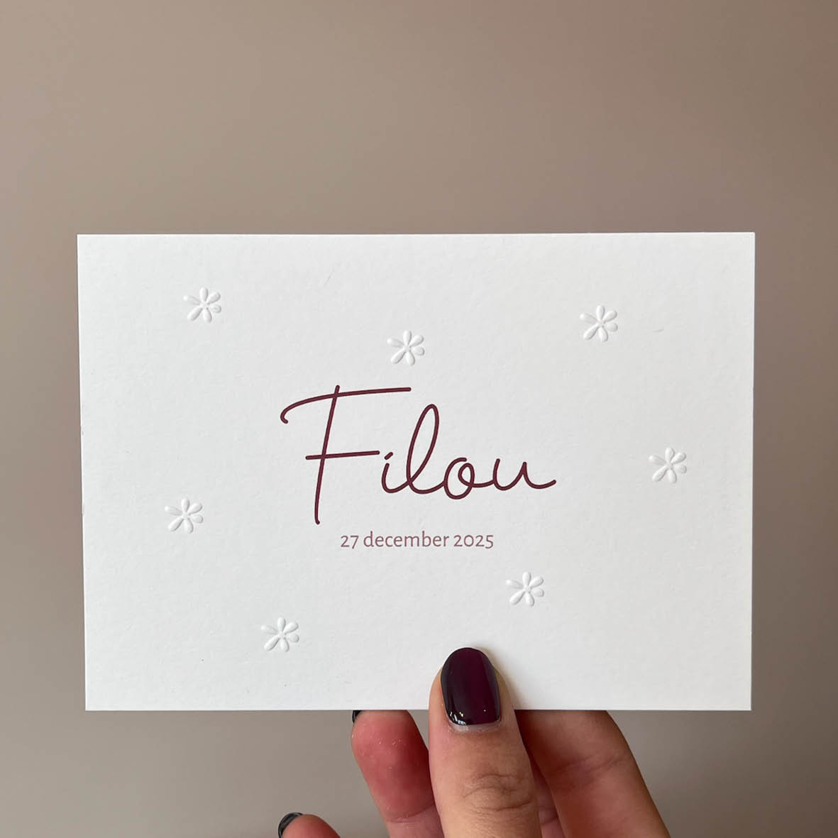 Geboortekaartjes met reliëfdruk (preeg) hebben een subtiele, tastbare uitstraling. Door delen van het ontwerp verhoogd in het papier te drukken ontstaat een elegant hoogteverschil, zonder inkt of kleur toe te voegen. Dit maakt reliëfdruk perfect voor minimalistische en tijdloze geboortekaartjes.