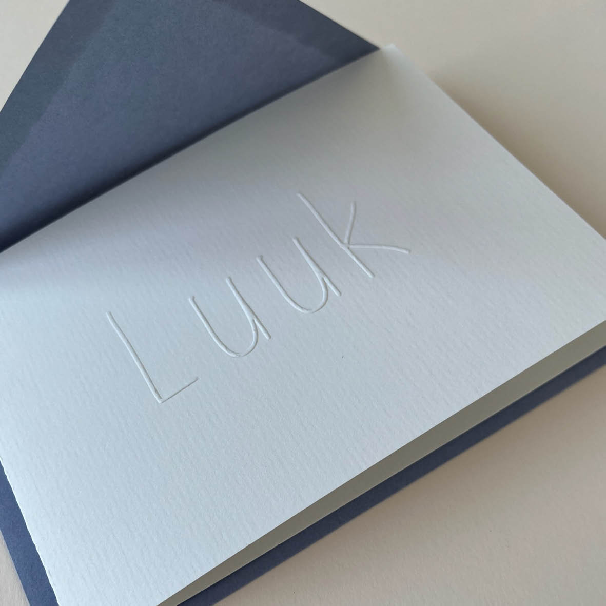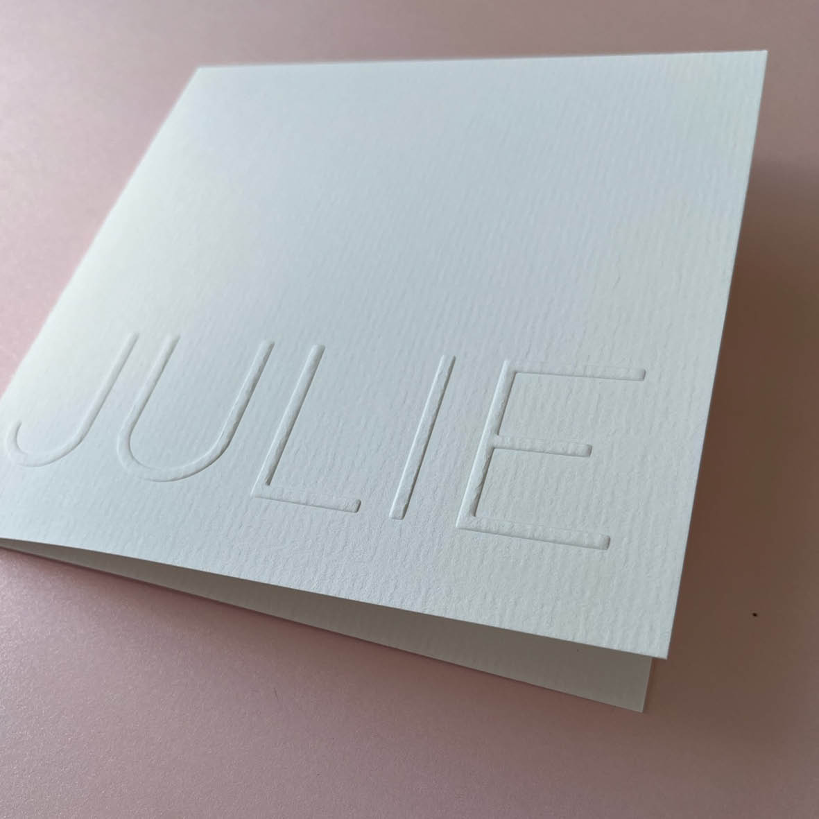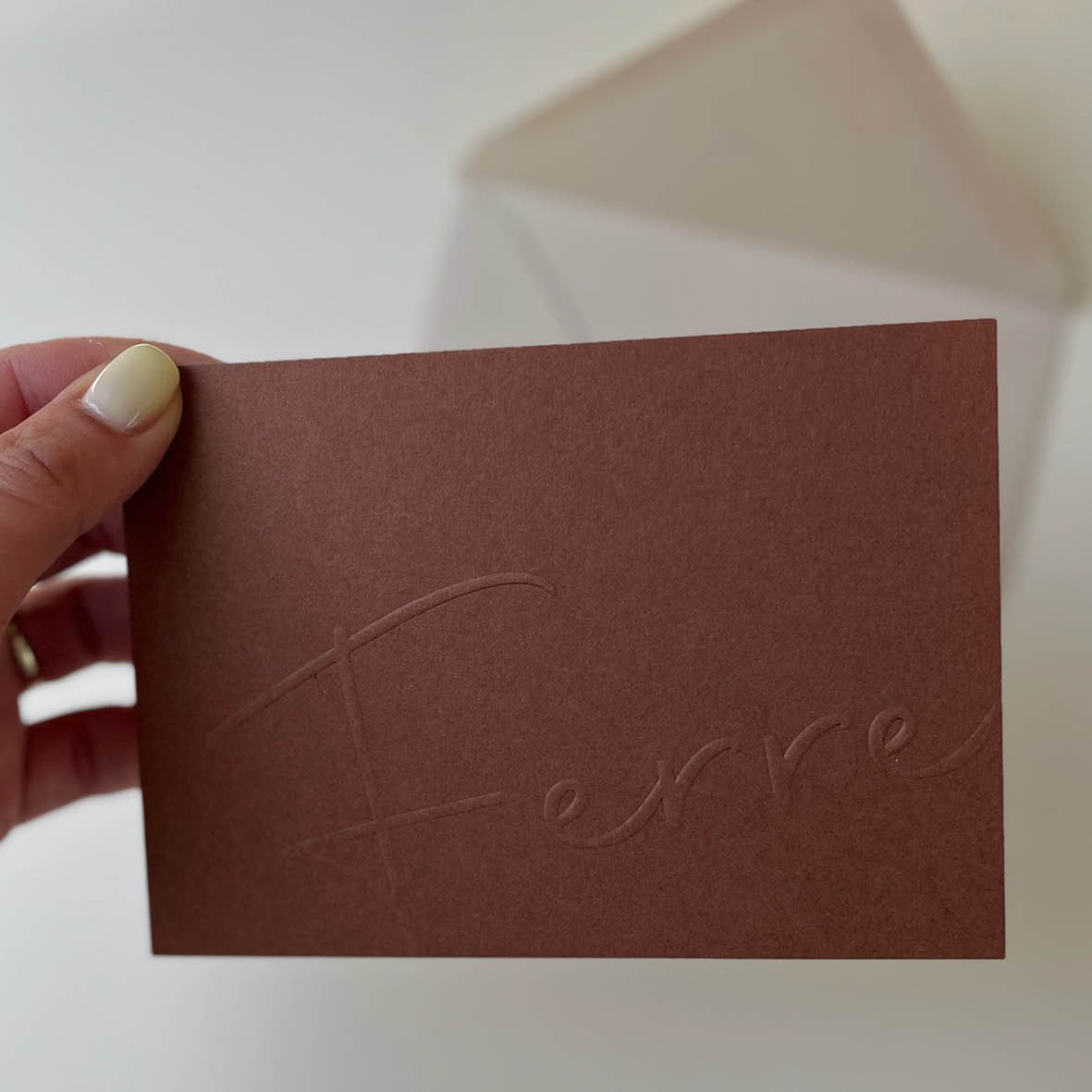 Laat je inspireren door kaartjes waarbij de naam, initialen of een klein symbool voelbaar naar voren komen.