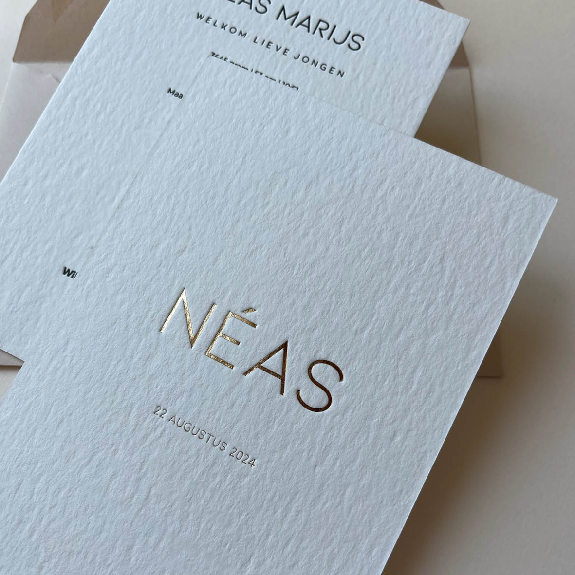 Op zoek naar inspiratie voor geboortekaartjes met letterpress? Letterpress is een ambachtelijke druktechniek waarbij de tekst en details voelbaar in het papier worden gedrukt waardoor een subtiel reliëf ontstaat. In combinatie met dik, zacht papier zorgt dit voor een karakteristiek kaartje. Letterpress is vooral geliefd bij minimalistische geboortekaartjes ontwerpen en klassieke.
