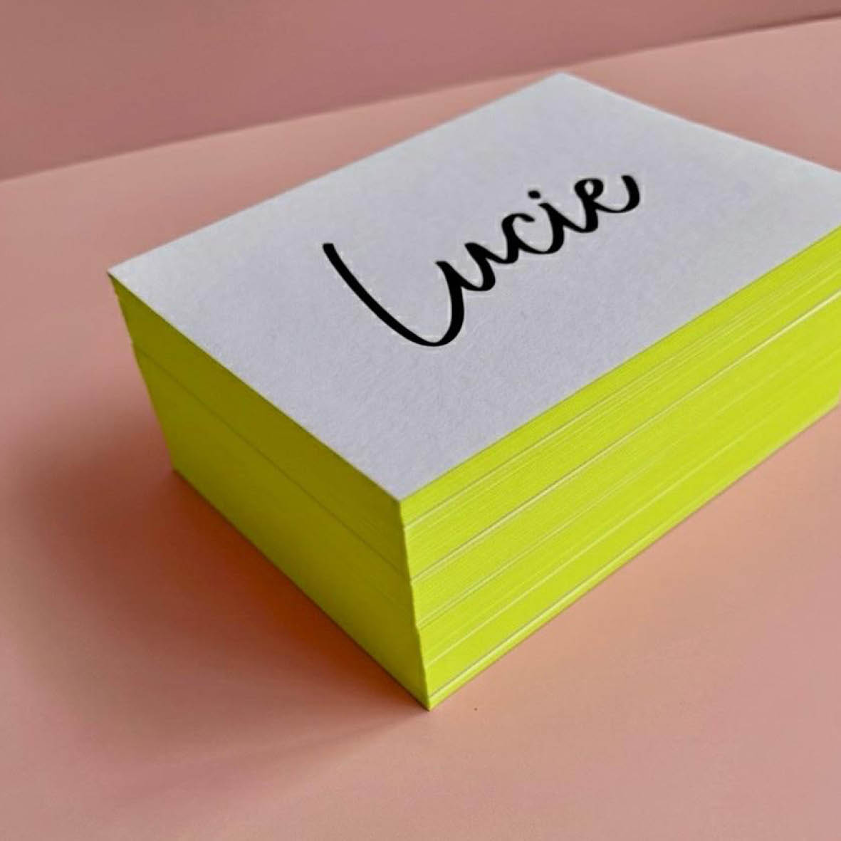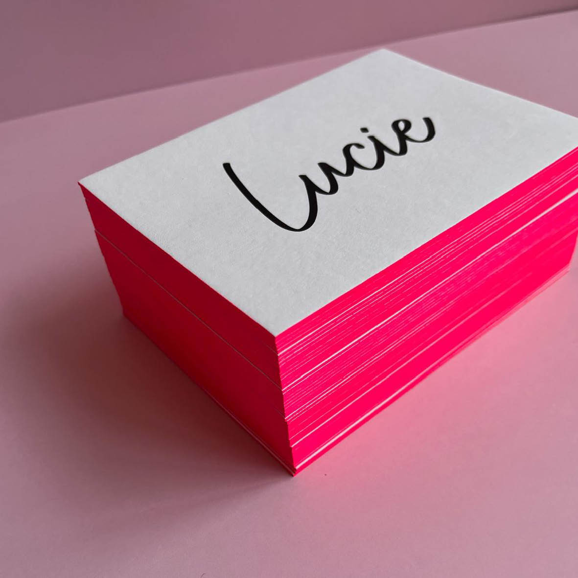 Gebruik niet meer dan 2 drukkleuren in een neon-kaart. Vanwege de vele handelingen en materialen is het niet aan te raden om een kaartje met meer dan 2 kleuren te drukken, deze wordt vaak te prijzig.